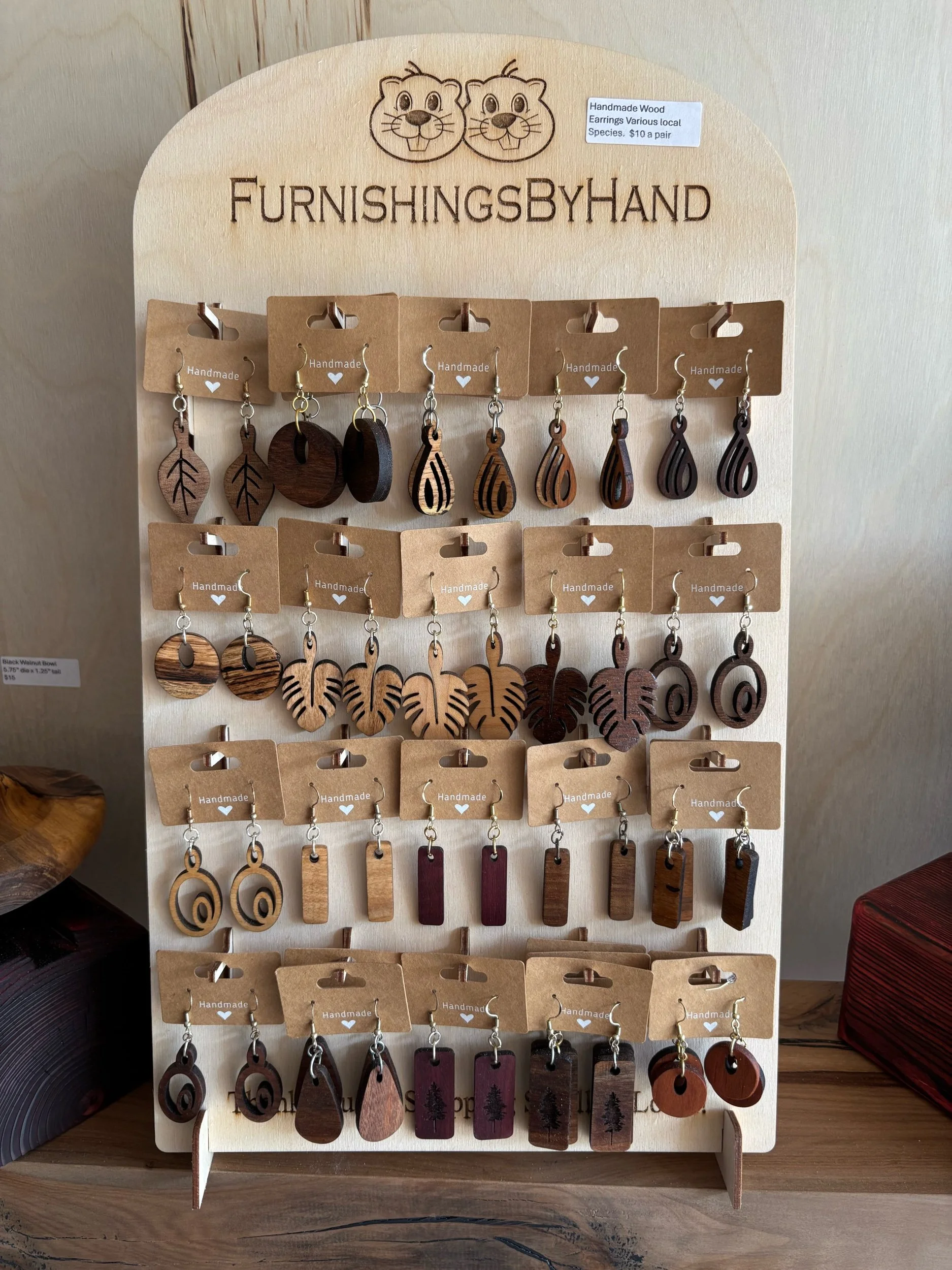 Handmade Wood Earrings - Various Species. The only wood not sourced from AWF is the Purpleheart, which came from cutting board scraps. Please note that the set shown in the photo may not be the exact one you receive—grain patterns vary with each pair, though all pieces are made from the same board of each wood species. What I love most about these wood earrings is how light they are!